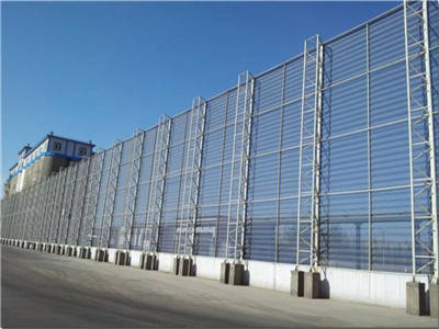用途:主要用于煤矿、焦化厂、电厂等企业工厂的储煤场;港口、码头储煤场及各种料场;钢铁、建材、水泥等企业各种露天料场;农作物防风,沙化天气防尘等恶劣环境;铁路、公路煤炭集运站储煤场、建筑工地、道路扬尘、高速公路两侧等。单层挡风抑尘墙抑尘效果可达65~85%,双层挡风抑尘墙效果可达95%以上;挡风抑尘墙不仅外形美观,维护成本低并且具备防火,防盗等优点;避免了以往表面覆盖、喷淋技术、全封闭几种措施反复投资、耗资巨大、受场地和作业要求限制、抑尘效果不佳的问题。